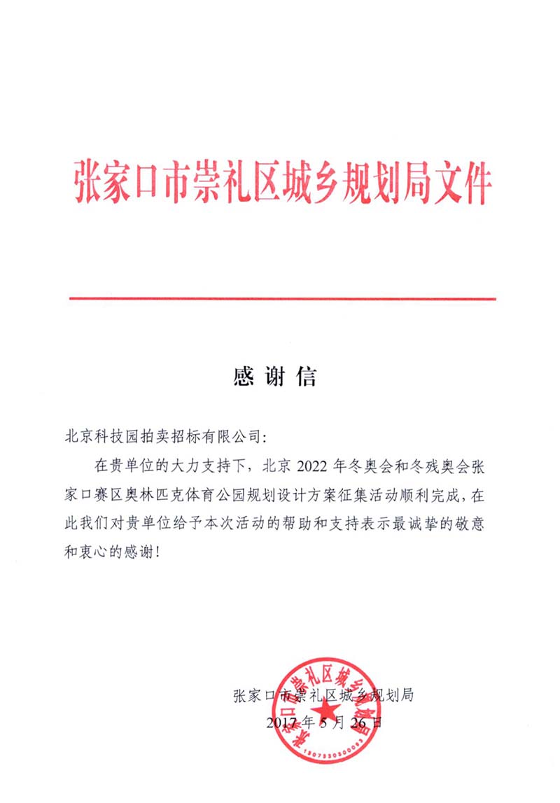2022冬奧會和動殘奧會張家口賽區奧林匹克體育公園規劃設計方案征集感謝信
